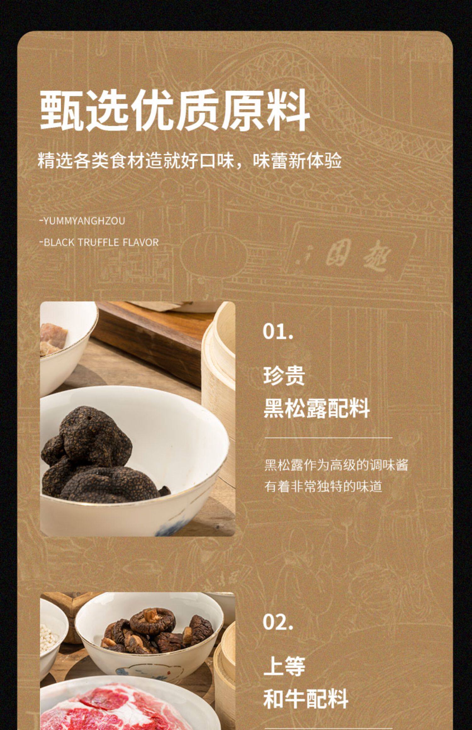 口味:黑松露和牛肉包50g*6 黑松露和牛肉烧麦50g*6 50g*6千层油糕 50g*6鲜肉包 50g*6青菜包 50g*6三丁包 50g*6细沙包 50g*6咸蛋黄烧麦 50g*6松籽烧麦 50g*6杂食包 70g*4五丁包